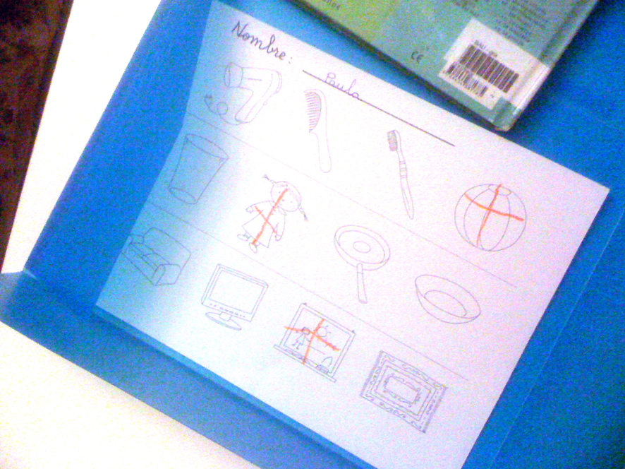 Observo a mi hija pequeña hacer una ficha en la que debe tachar el objeto que no comparta el mismo contexto que el resto de objetos del grupo; hay una pelota de playa entre útiles de aseo, una muñeca entre cacharros de cocina y una pizarra escolar colocada junto a elementos del salón.